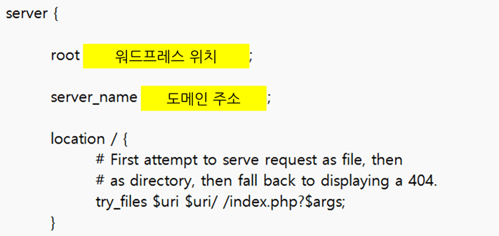 참고로 서버 블록은 아래와 같은 형태 입니다. 아래를 보시면 저의 경우 이미 location 블록이 추가 되어 있는것이 보이실텐데요. 기존에 있던 블럭은 그대로 두고 location 블럭을 추가할수 있기 때문에 뒤에 붙쳐 넣기 하시면 되겠습니다.
